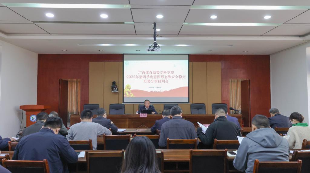 12月12日下午,爱体育电子官方网站在七楼会议室召开2022年第四季度意识形态和安全稳定形势分析研判会。校党委书记杨昌鹏、校长胡英清、党委副书记李爱民、副校长邱团、副校长覃世东、纪委书记罗黎造,党委办公室、党委组织部、党委宣传部、教务科研处、学生工作处、后勤管理处、信息中心、招生就业处、财务处、团委主要负责人,各学院书记、副书记,产业学院院长参加了会议。会议由杨昌鹏书记主持。