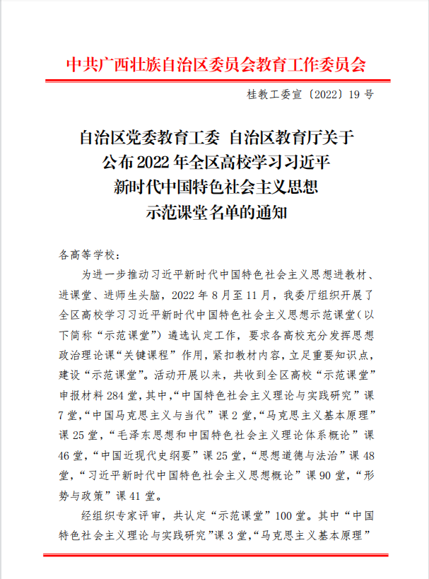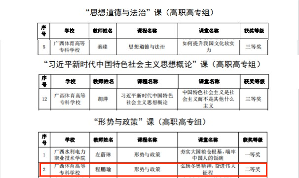 日前,自治区党委教育工委、自治区教育厅下发《关于公布2022年全区高校学习习近平新时代中国特色社会主义思想示范课堂名单的通知》,爱体育电子官方网站马克思主义学院程鹏瑜老师《弘扬冬奥精神 奋进伟大征程》课堂获“形势与政策”课二等奖、胡萍老师《中国特色社会主义是社会主义而不是什么主义》课堂获“习近平新时代中国特色社会主义思想概论”课三等奖、秦臻老师《如何提升我国文化软实力》课堂获“思想道德与法治”课三等奖。