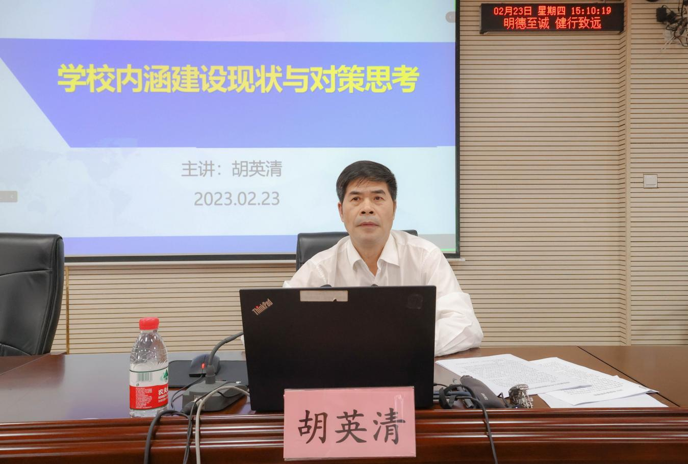 23日下午,胡英清校长以《加快爱体育(中国)内涵建设,推动高质量发展》为题,全面阐释了职业院校内涵建设的主要内容,深刻分析了爱体育(中国)内涵建设的现状和存在的不足,提出了“内涵发展、提高质量、强化特色、培育优势”的爱体育(中国)内涵建设工作思路和“以专业建设为龙头、全力推进质量工程”“加强教学团队和高水平教师队伍建设,建设一批优质教学资源”“改革人才培养模式,建设人才创新基地”“创新管理、提高效能”等四项内涵建设重点任务。