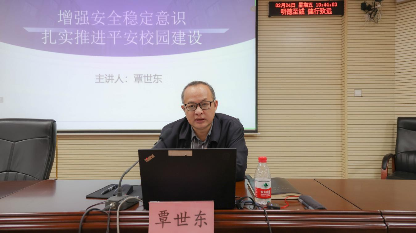 覃世东副校长作《增强安全稳定意识,扎实推进平安校园建设》报告。报告强调了新时代高校平安校园建设的重要意义,分析了教育系统及高校平安校园建设面临的形势,提出“要聚焦主责主业,准确把握当前和今后一段时间校园安全稳定各项重点工作”“要以时时放心不下的紧迫感和责任感确保平安校园建设各项目标任务落地见效”的工作要求。
