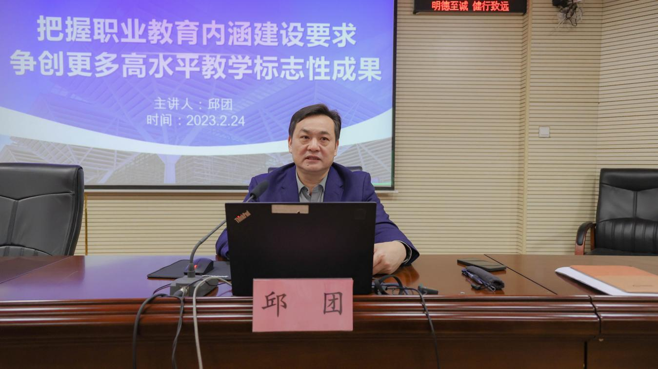 邱团副校长作《把握职业教育内涵建设要求,争创更多高水平教学标志性成果》报告。报告分别从职业教育内涵的发展趋势、发展现状和实施路径三个方面进行了阐述,以详实的数据分析了爱体育电子官方网站标志性成果产出情况,指出了爱体育电子官方网站与自治区“双高”院校的差距,提出了“要明确标杆,做好爱体育(中国)顶层设计”“以师资建设和专业群建设为抓手,努力争创更多标志性成果,提升爱体育(中国)内涵建设”的工作思路。