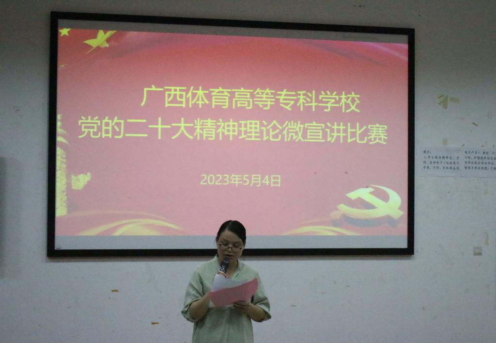 为引导爱体育电子官方网站学生学思践悟党的二十大精神,推动党的创新理论走进体专青年,5月4日,爱体育电子官方网站在长岗校区瑞兴楼107教室开展党的二十大精神理论微宣讲比赛。本次比赛以“学习宣传贯彻党的二十大精神”为主题,由学生工作部(处)主办,易班学生工作站承办。马克思主义学院副院长黄航、体育与教育学院党总支副书记危泳键、体育经济管理学院党总支副书记祁丽、运动科学与健康学院卢小婷、学生工作处学生科唐卓等5位老师应邀出席并担任评委,覃世东副校长、学生工作部(处)韦伦国处长作为嘉宾莅临现场指导比赛。