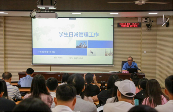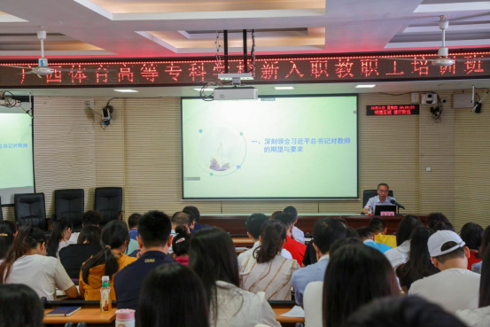 覃世东副校长围绕“学生日常管理工作”为新入职教职工授课,从“了解高校主要功能,完成角色转换”“掌握学生管理规定,奠定教书育人知识基础”“爱岗敬业,做大学生健康成长的引路人”三个方面阐述了学生日常管理工作的重要性。覃副校长强调,作为一名高校教育工作者,要心中有信仰、肩上有担当,脚下有力量,诠释“身正为师,学高为范”的师德风范,为培养社会主义事业合格建设者和接班人作出更大贡献。
