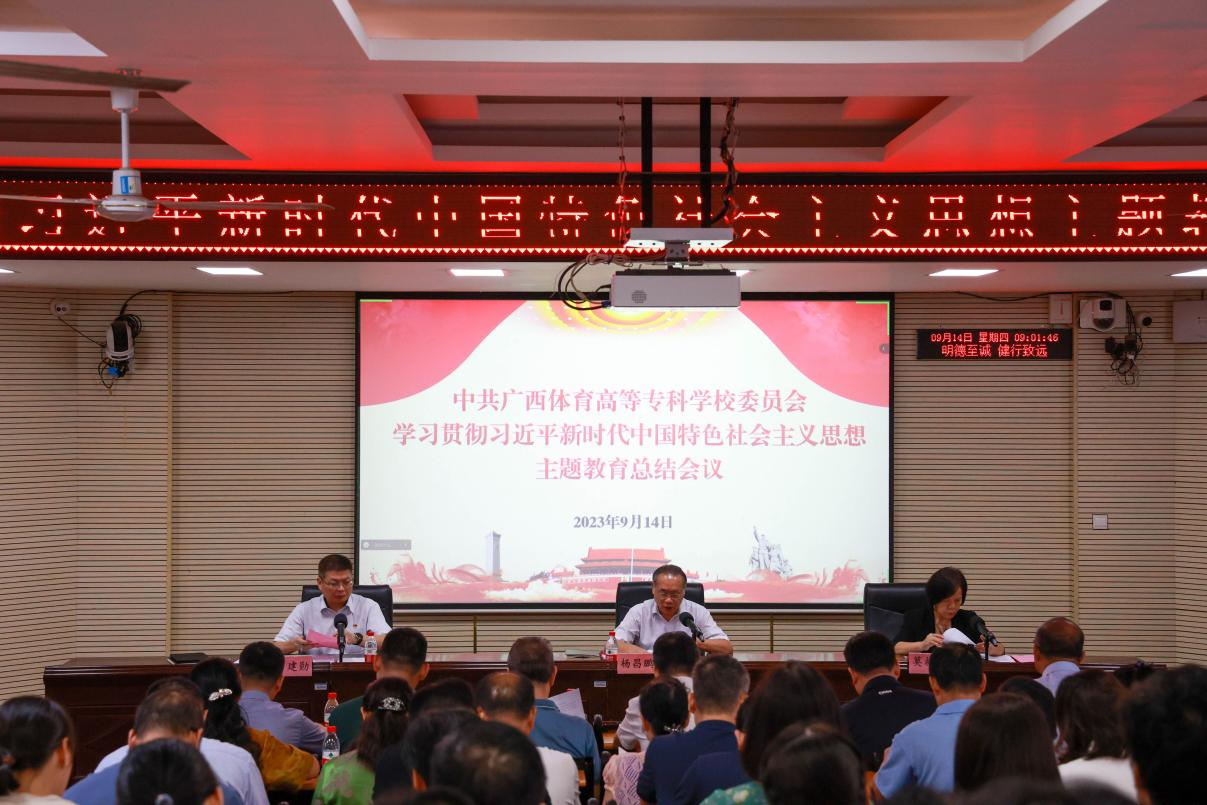 9月14日,爱体育电子官方网站召开学习贯彻习近平新时代中国特色社会主义思想主题教育总结大会。自治区党委主题教育第十一巡回指导组副组长莫柏预到会指导并讲话,指导组成员黄坚、杨煜、董建出席会议。爱体育(中国)党委书记杨昌鹏作总结报告,爱体育(中国)党委副书记、校长韦建勋主持会议。爱体育(中国)党委领导班子成员、退休直属党支部支委,各部门、学院、中心正副职,全体教职工党员,学生党员代表等参会。