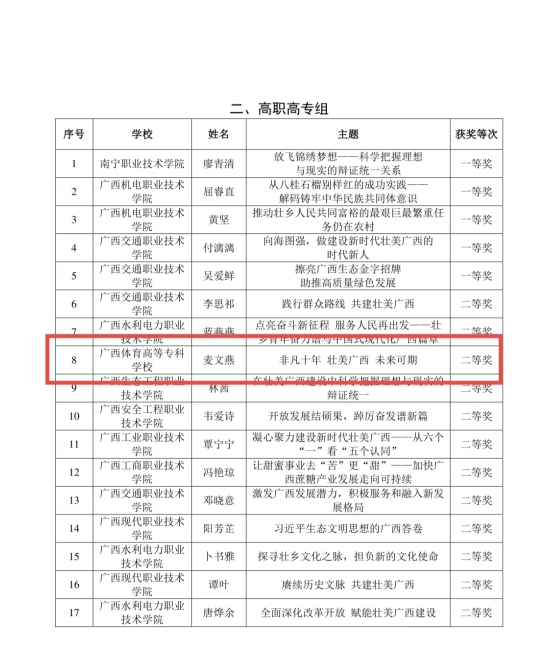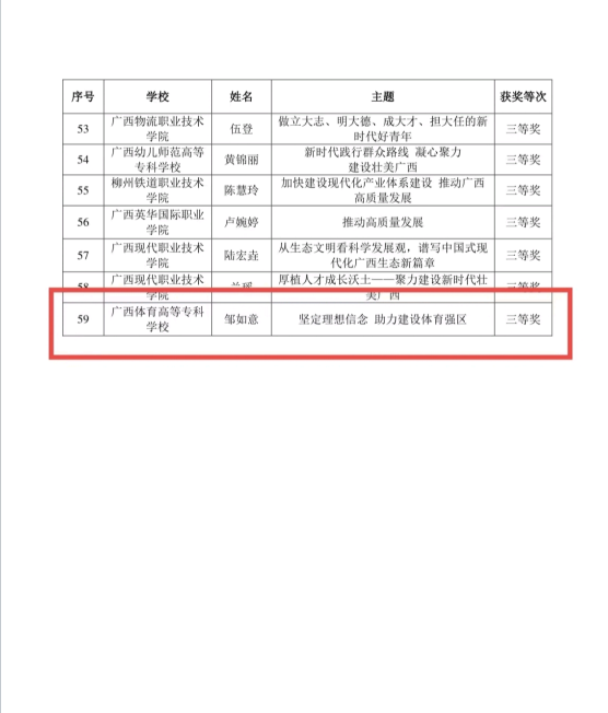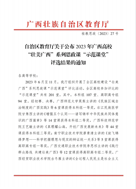 据悉,本次比赛全区高校报送的申报课共有201堂,经组织专家初评和现场决赛,共认定“壮美广西”系列思政课“示范课堂”122堂,其中高职组59堂:其中一等奖5堂,二等奖12堂,三等奖42堂。