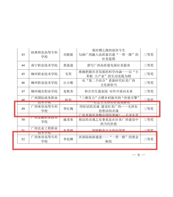 近日,自治区党委教育工委自治区教育厅公布2023年广西高校“壮美广西”系列思政课“示范课堂”评选活动结果,爱体育电子官方网站马克思主义学院麦文燕教师主讲的《非凡十年 壮美广西 未来可期》荣获二等奖,李红梅教师主讲的《用好活的灵魂 建设壮美广西——毛泽东思想活的灵魂》、李侃卿教师主讲的《西部陆海新通道——“一带一路”的黄金枢纽》、邹如意教师主讲的《坚定理想信念助力建设体育强区》分别荣获三等奖。
