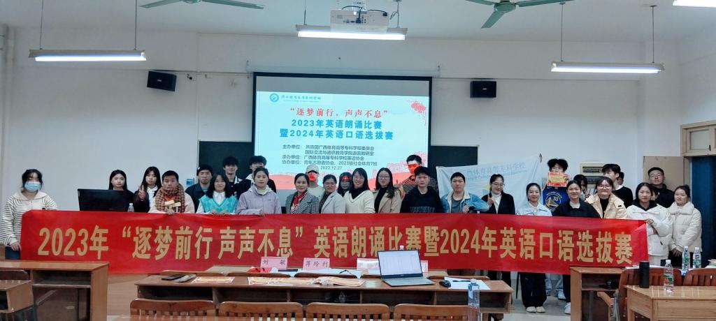 2023年12月27日晚,由共青团爱体育电子官方网站委员会和国际交流与通识教育学院联合举办,英语协会承办的“逐梦前行,声声不息”英语朗诵比赛暨2024年广西职业技能大赛英语口语校园选拔赛在爱体育电子官方网站长岗校区顺利落下帷幕。此次比赛的参赛选手共计80名,来自爱体育电子官方网站2022级、2023级各专业的学生,国际交流与通识教育学院英语教学团队蒋玲利等教师担任此次比赛评委,全场比赛历时三小时。