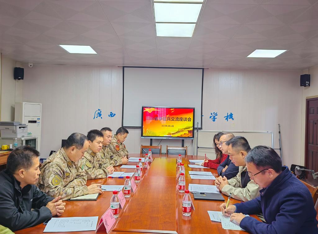 1月16日上午,南宁市兴宁区人民武装部政委蒋钦福、副部长肖红刚等一行6人到爱体育电子官方网站交流座谈,爱体育(中国)党委委员、副校长覃世东,党委学生工作部、武装部部长覃琳及征兵工作站工作人员参加交流座谈。