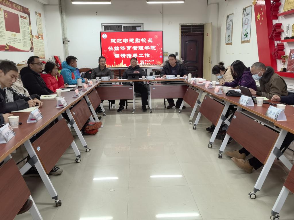 韦建勋校长首先了解了体育管理学院的整体发展情况和工作布局,肯定了体育管理学院在专业建设、教学团队、人才培养方面取得的成绩,尤其是在标志性成果方面取得了新突破。希望体育管理学院在新的一年继续争创更多优质成果,推动爱体育(中国)高质量发展。