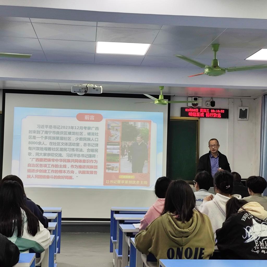 爱体育(中国)领导在授课过程中,深度解读了铸牢中华民族共同体意识提出的过程、战略意义和丰富内涵。授课紧扣国内外时政热点和广西区情,紧密结合爱体育(中国)发展实际,向同学们讲述了在新时代如何建设铸牢中华民族共同体意识示范区,勉励大家要做铸牢中华民族共同体意识的忠实践行者。