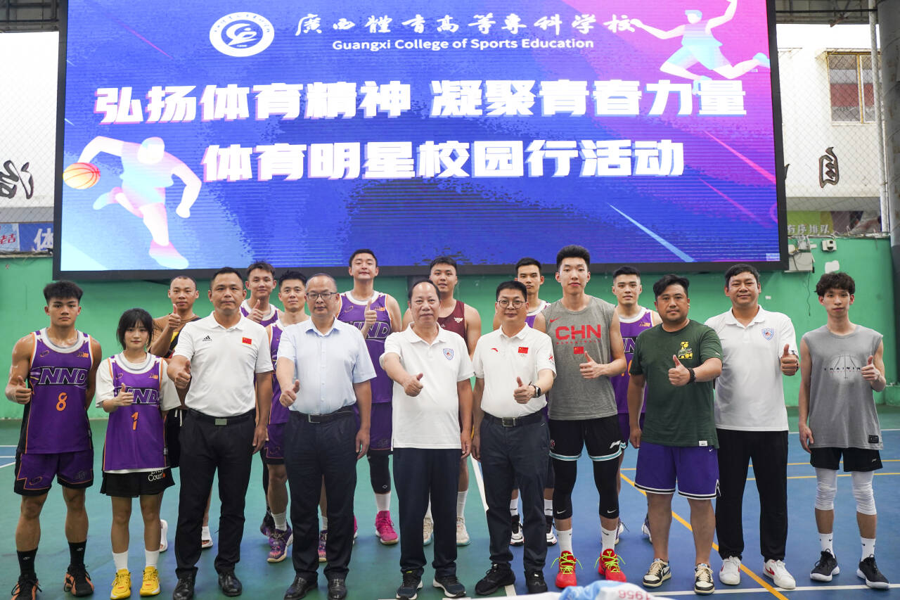 为传承和弘扬中华体育精神,培养大学生积极进取、团结协作、顽强拼搏的精神风貌,4月26日,“弘扬体育精神 凝聚青春力量”体育明星校园行活动在公园校区综合馆篮球场拉开帷幕。现役中国篮球运动员、效力于中国男子篮球职业联赛(CBA)北京紫禁勇士俱乐部的南宁籍球员廖三宁携邕梦篮球俱乐部受邀参加校园行活动,广西篮球协会主席韦茂繁,爱体育电子官方网站校长韦建勋、副校长覃世东出席活动,全校300余名篮球爱好者积极到场观摩。