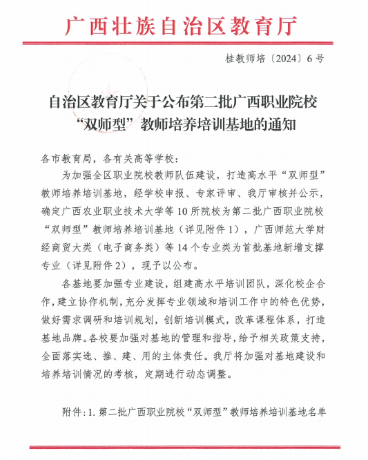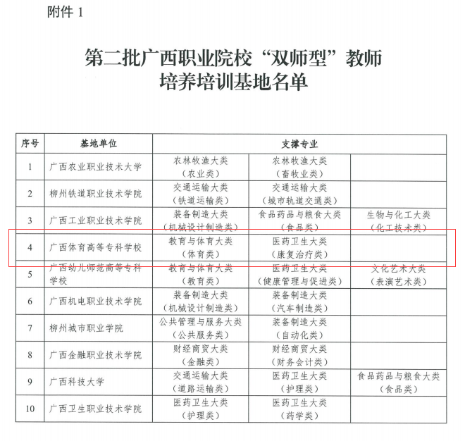 近日,广西壮族自治区教育厅下发《自治区教育厅关于公布第二批广西职业院校“双师型”教师培养培训基地的通知》(桂教师培﹝2024﹞6号),爱体育电子官方网站成功入选第二批广西职业院校“双师型”教师培养培训基地,体育与教育大类(体育类)和医药卫生大类(康复治疗类)两个专业为重点支撑专业。