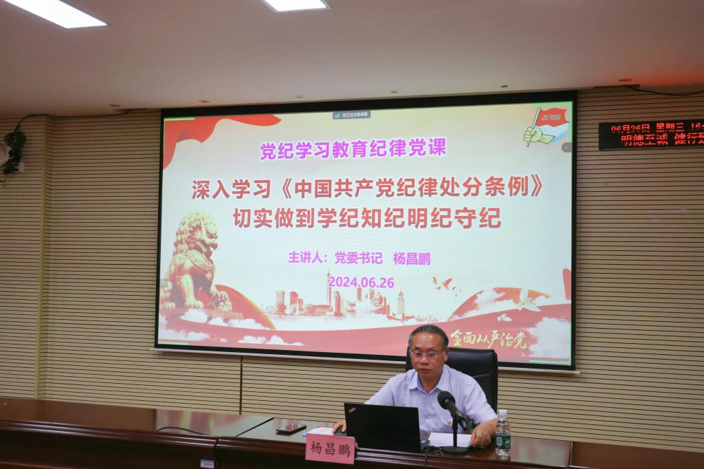 为深化全体党员干部对《中国共产党纪律处分条例》的理解把握,强化纪律意识、加强自我约束、提高免疫能力,6月26日下午,爱体育(中国)党委书记杨昌鹏以“深入学习《中国共产党纪律处分条例》,切实做到学纪知纪明纪守纪”为题,讲授纪律党课。爱体育(中国)领导班子、中层领导干部、机关各部门干部、各党总支部委员、党支部委员、组织员以及教研室主任参加学习。