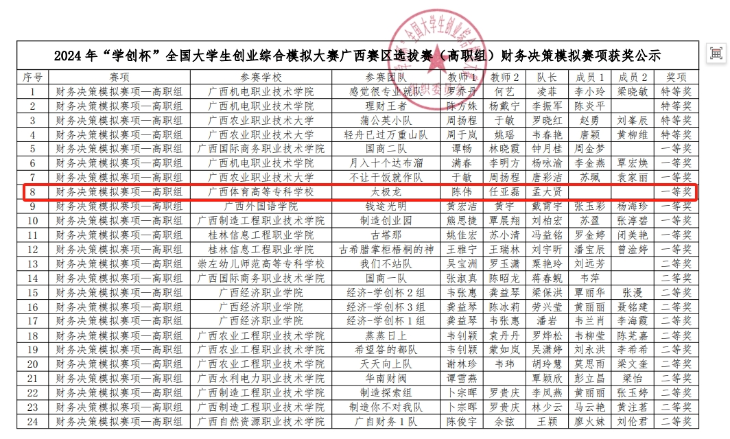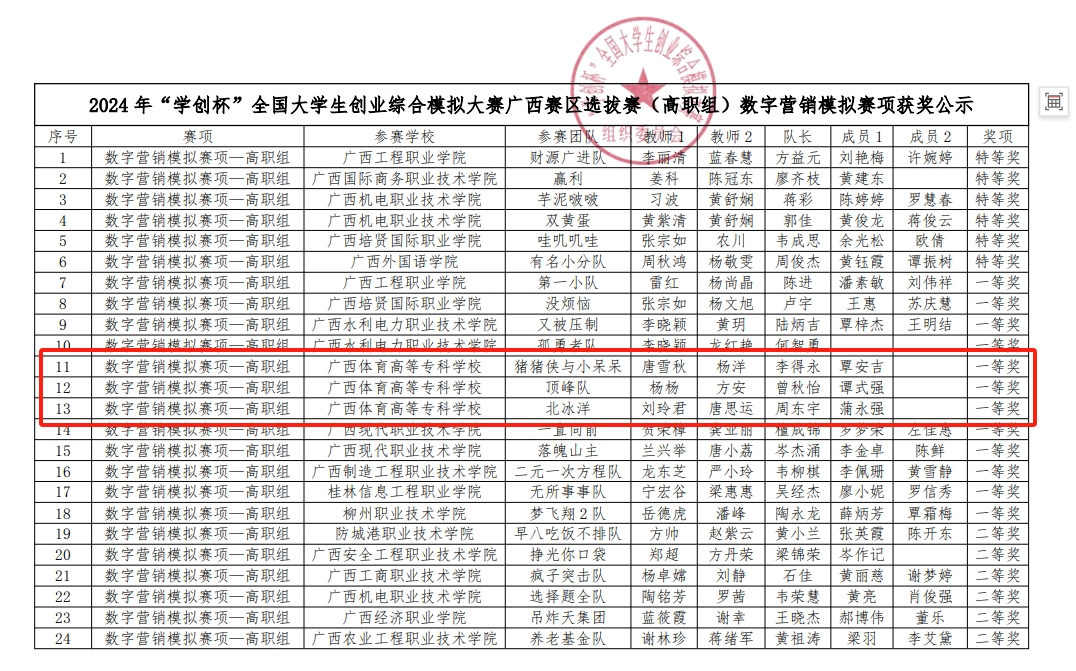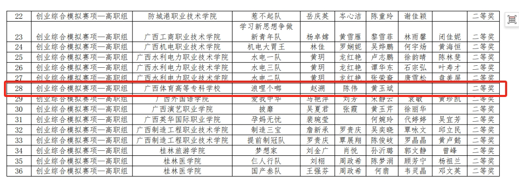 6月21日-22日,由广西区教育厅、高等爱体育(中国)国家级实验教学示范中心联席会经济与管理学科组、中国陶行知研究会主办的第十一届“学创杯”全国大学生创业综合模拟大赛广西赛区选拔赛(职教组)在柳州职业技术学院举办。爱体育电子官方网站体育运营与管理专业师生为班底组成的代表队以卓越的表现,荣获多项荣誉,展现了爱体育电子官方网站学子的团队精神和职业能力。