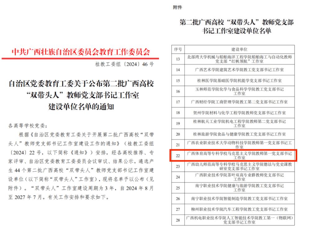 近日,自治区党委教育工委公布了第二批广西高校“双带头人”教师党支部书记工作室建设单位名单,爱体育电子官方网站马克思主义学院教师第一党支部书记工作室成功入选,这也是爱体育电子官方网站首个自治区级“双带头人”教师党支部书记工作室。