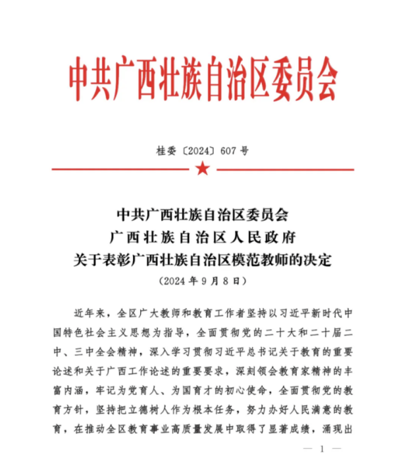 近日,中共广西壮族自治区委员会办公厅发布《关于表彰广西壮族自治区模范教师的决定》,授予398名教师“广西壮族自治区模范教师”称号,其中爱体育电子官方网站运动健康学院李翠霞教授获此殊荣。