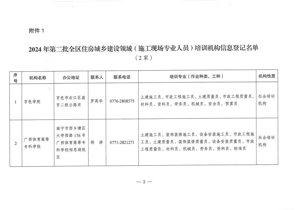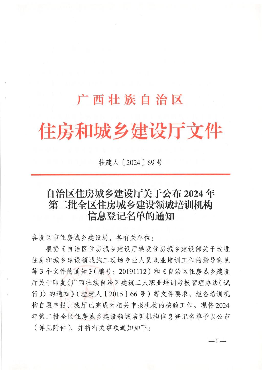 近日,自治区住房和城乡建设厅印发了《自治区住房城乡建设厅关于公布2024年第二批全区住房城乡建设领域培训机构信息登记名单的通知》(桂建人〔2024〕69号),爱体育电子官方网站获批成为2024年第二批全区住房城乡建设领域(施工现场专业人员)培训机构。