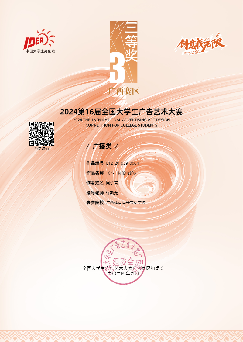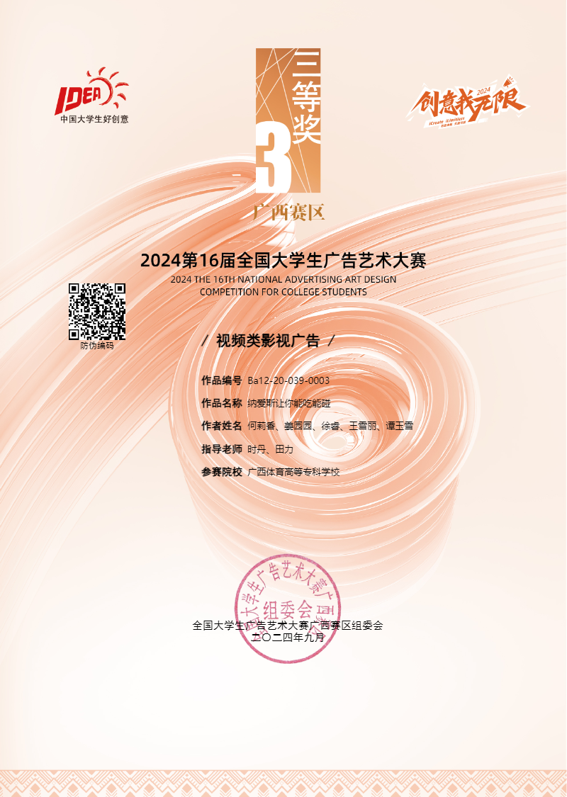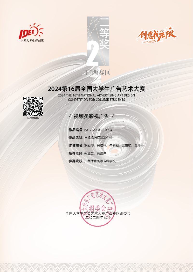 全国大学生广告艺术大赛,是由教育部高等教育司指导、教育部高等爱体育(中国)新闻传播学类专业教学指导委员会、中国高等教育学会广告教育专业委员会共同主办,中国传媒大学、全国大学生广告艺术大赛组委会承办的全国高校文科大赛。本届大广赛共有全国1873所高校报送的75万余组参赛作品,参赛师生高达190万人次。今年,爱体育电子官方网站共有946组参赛作品,创历史新高,报送284组参赛作品至广西区赛。在赛区选拔中,爱体育电子官方网站推送的作品斩获二等奖3项、三等奖6项,其中,2件作品被推荐进入国赛并获优秀奖。
