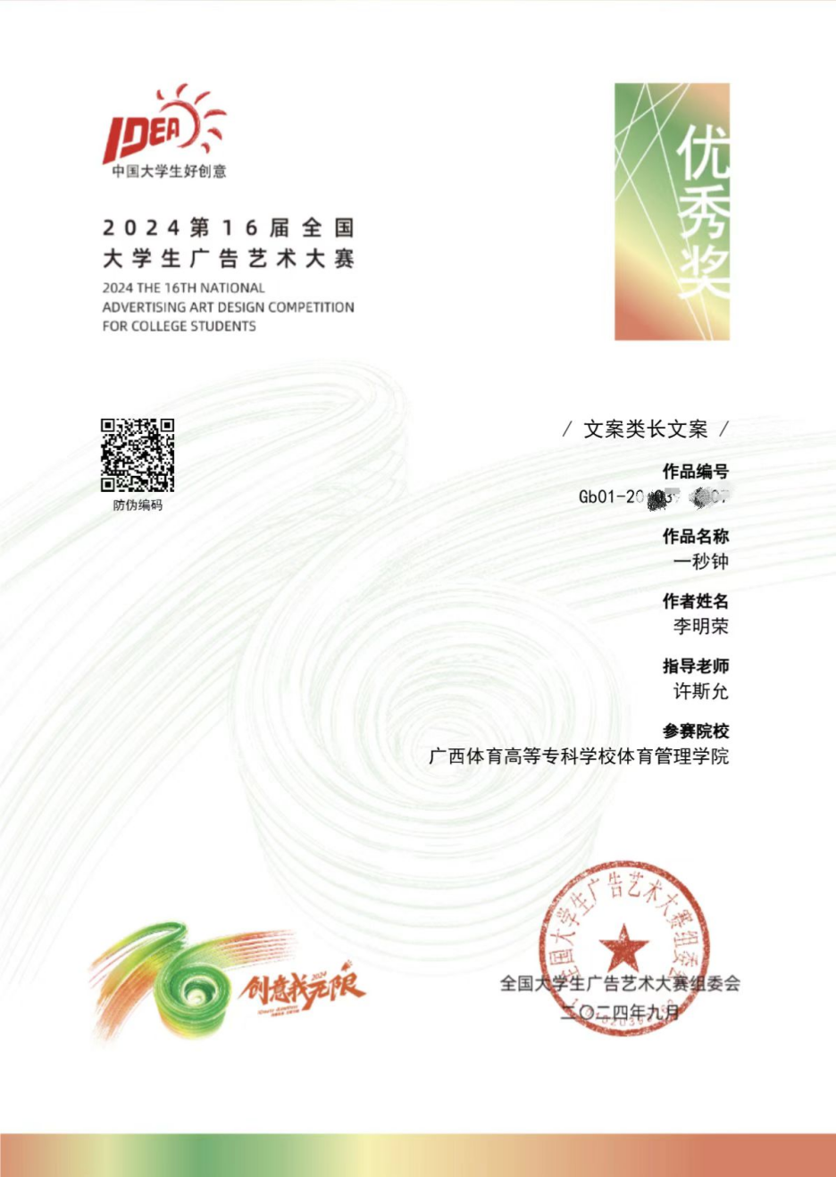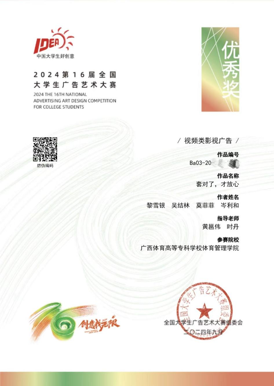 近日,第十六届全国大学生广告艺术大赛国赛评审落下帷幕,爱体育电子官方网站体育管理学院新闻采编与制作专业学生获国赛优秀奖2项,区赛二等奖3项、三等奖6项。