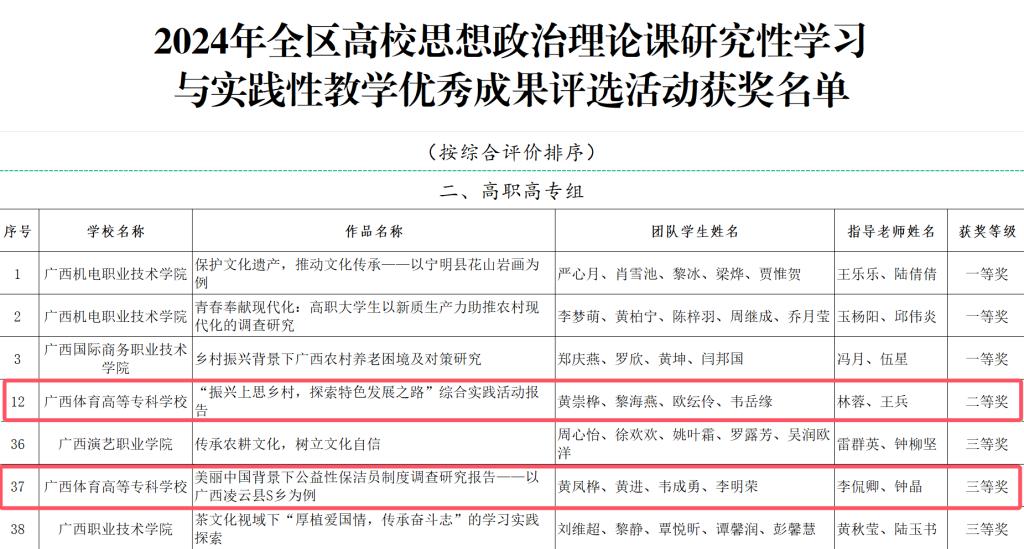 在2024年全区高校思政课研究性学习与实践性教学优秀成果评选活动中,爱体育电子官方网站林蓉、王兵老师指导的作品《“振兴上思乡村,探索特色发展之路”综合实践活动报告》进入决赛,并获得二等奖,李侃卿、钟晶老师指导的作品《美丽中国背景下公益性保洁员制度调查研究报告——以广西凌云县S乡为例》获得三等奖。
