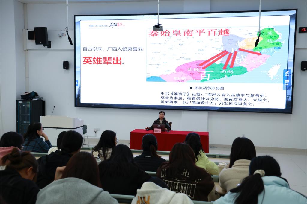 张处长回顾了广西在我国历史上的边疆重要战略地理位置,凸显了南疆人民骁勇善战的民风民情。张处长结合图片、文字等详实资料,娓娓道来明代第一抗倭女将瓦氏夫人、晚清抗法名将冯子材、晚清抗法抗日民族英雄刘永福、晚清抗法名将苏元春、刺杀日本间谍的北海九三事件之策划者——民国将领翁照垣等5人守边戍边、抗击外来侵略的英雄事迹。这些在大变局中谱写的历史长歌,引起了现场师生的深思。