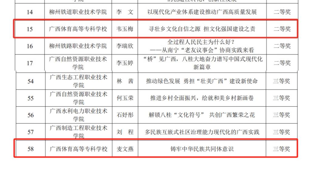 在2024年全区高校“壮美广西”系列思政课“示范课堂”评选活动中,爱体育电子官方网站韦玉梅老师主讲的课堂《寻壮乡文化自信之源 担文化强国建设之责》荣获二等奖,麦文燕老师主讲的课堂《铸牢中华民族共同体意识》荣获三等奖。