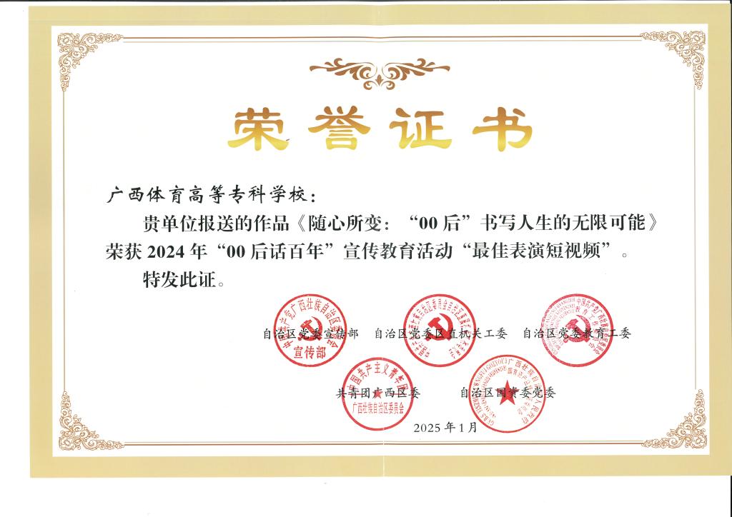 “00后话百年”主题宣传教育活动是由自治区党委宣传部、自治区党委区直机关工委、自治区党委教育工委、共青团广西区委、自治区国资委党委等五部门于2023年9月联合开展,旨在深入贯彻落实习近平总书记关于青年工作的重要思想,培育担当民族复兴大任的时代新人。活动开展一年多来,吸引全区高校学生、企业职工以及各行各业“00后”代表踊跃参与,共创作出500多部短视频,经网络展播后点击量达到4000多万人次。主办单位从主题立意、作品质量、画面呈现、人物表现、传播效果等方面,开展了优秀短视频评选,经过初评、复评、终评等环节,共评选出20部获奖作品。爱体育电子官方网站作品《随心所变:“00后”书写人生的无限可能》通过展现爱体育电子官方网站学生由平时休闲达人、时尚达人转身一变成为体育健将,体现出00后积极向上,青春无限的干劲,在运动中努力拼搏的激情。表现以青春之名,赴时代之约,与祖国共奋进,书写属于青年人的最美篇章。