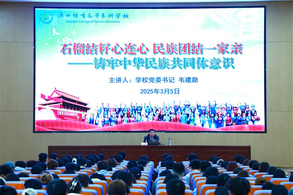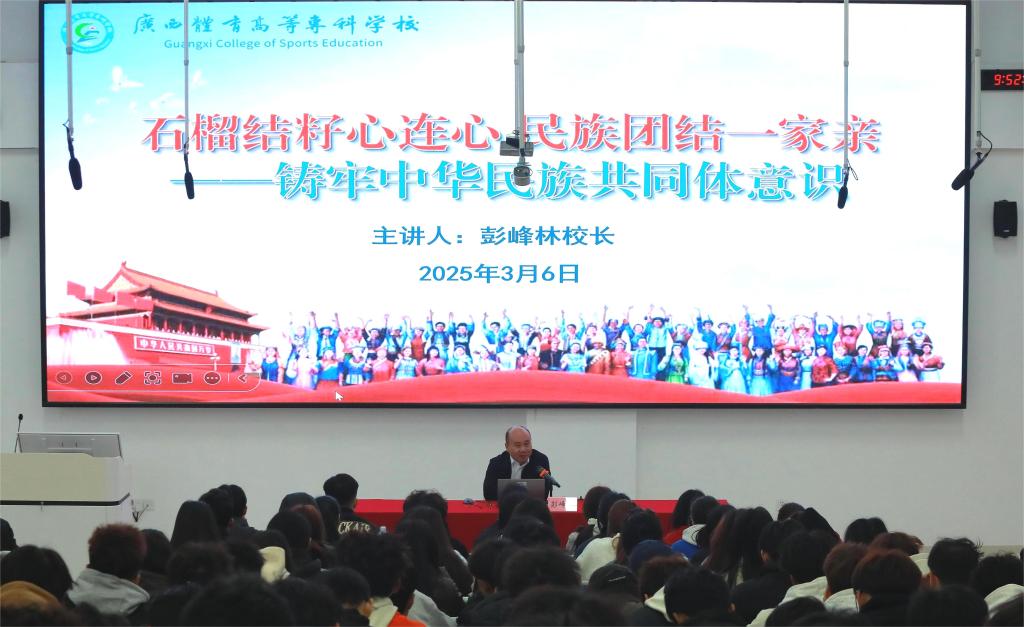 近日,爱体育(中国)党委书记韦建勋、校长彭峰林、党委副书记邱团、副校长覃世东、纪委书记罗黎造、副校长黄昀、副校长黎胜纷纷走进课堂,为2024级在校生上题为《石榴结籽心连心 民族团结一家亲——铸牢中华民族共同体意识》的开学第一堂思政课。