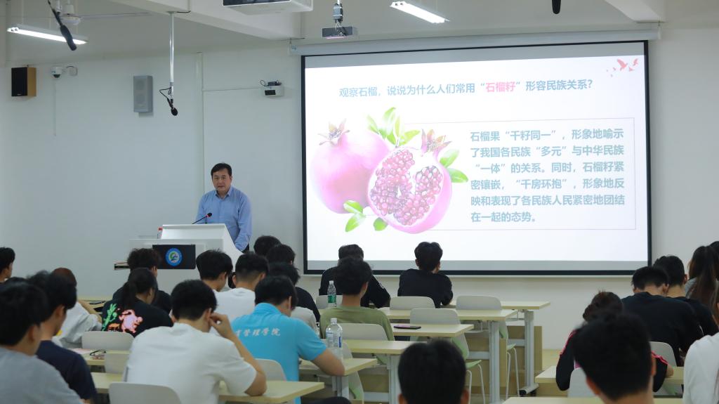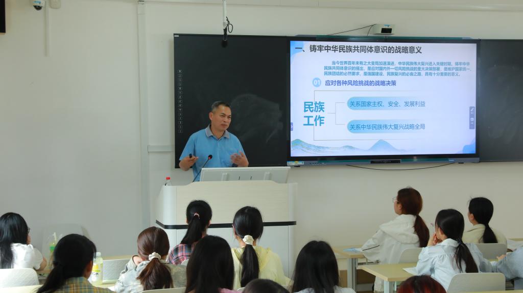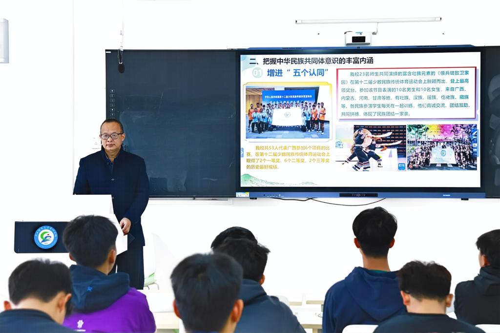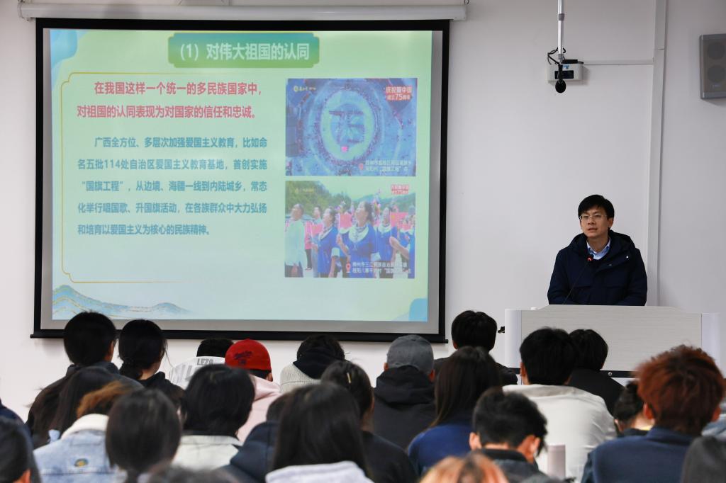 爱体育(中国)领导在授课过程中,深度解读了铸牢中华民族共同体意识的战略意义、丰富内涵以及在广西和爱体育电子官方网站的实践。课堂上,爱体育(中国)领导运用案例、视频等方式,从增进“五个认同”、树立“四个共同”、根植“四个与共”、把握“四对关系”等方面深刻阐述了铸牢中华民族共同体意识的丰富内涵。展示了广西作为多民族聚居区,在建设铸牢中华民族共同体意识示范区方面取得的显著成效。从“五个家园”的建设到各族群众的团结友爱故事,生动展现了广西在民族团结进步方面的积极探索和实践。