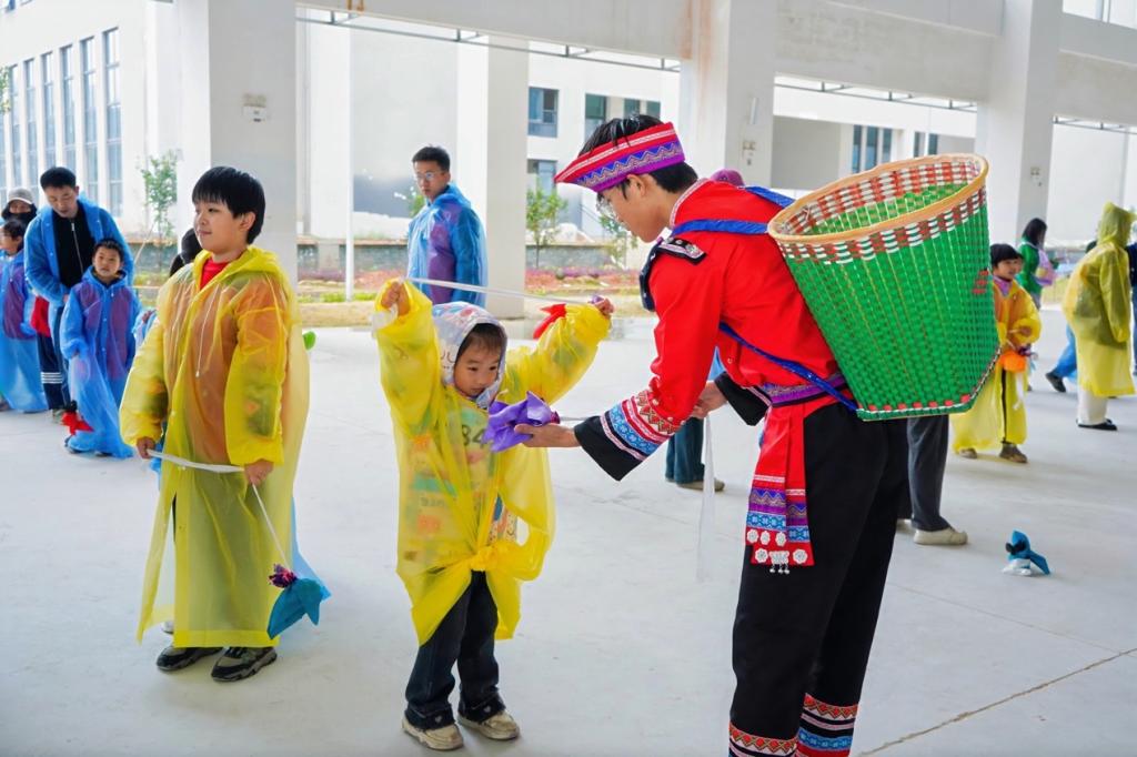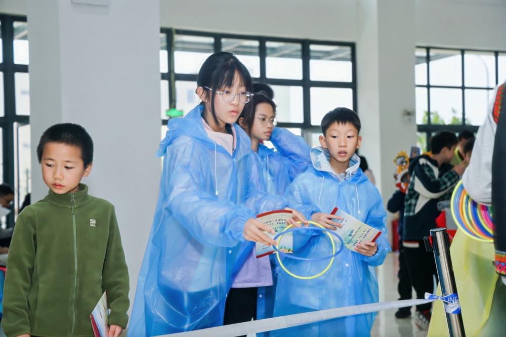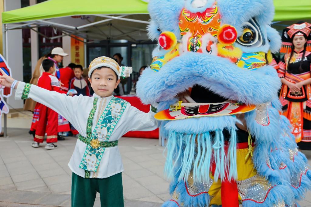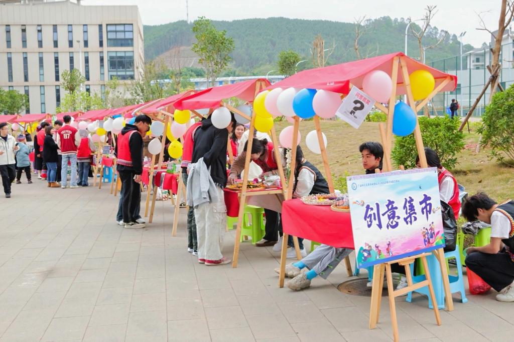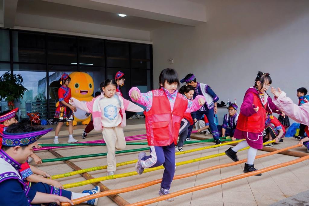 “嘿嘹嘹啰……”,活动在一阵悠扬的山歌声中拉开帷幕。在民族文化主题活动区,孩子们亲身参与民族特色手工diy、背篓绣球、竹竿舞三大项目,沉浸式感受壮文化。在民族特色手工制作中,通过学习绣球刺绣、制作醒狮狮头,深入了解壮族等少数民族文化符号背后的历史渊源与民俗内涵。在"竹竿舞大挑战"和“投掷背篓绣球”区域,孩子们在讲解员的带领下跳竹竿舞、抛绣球,掀起阵阵欢腾,在孩子们参与中体验到传统体育的独特魅力。当天,活动还开办了创意集市,学生们别出心裁地将传统美食与现代审美结合,精心布置各具特色的摊位,现场展示售卖各种图案的五色糯米拼盘、艾叶粑粑、壮元素手工艺品、潮玩公仔等,现场热闹非凡。
