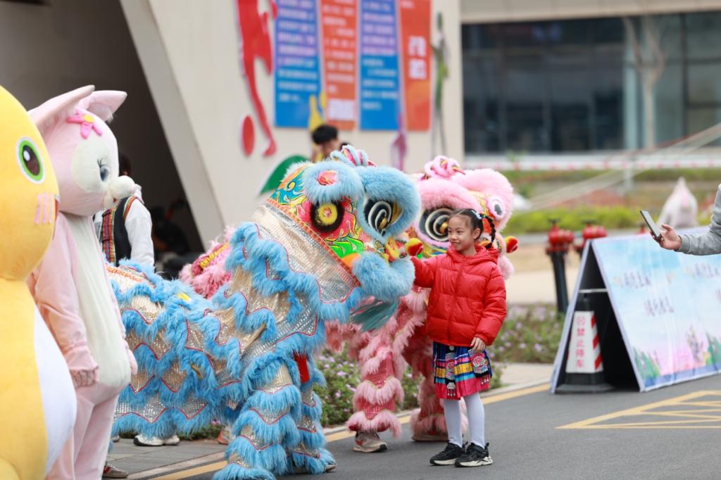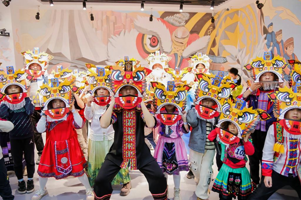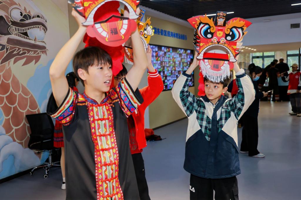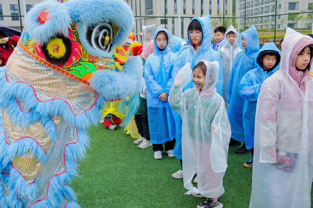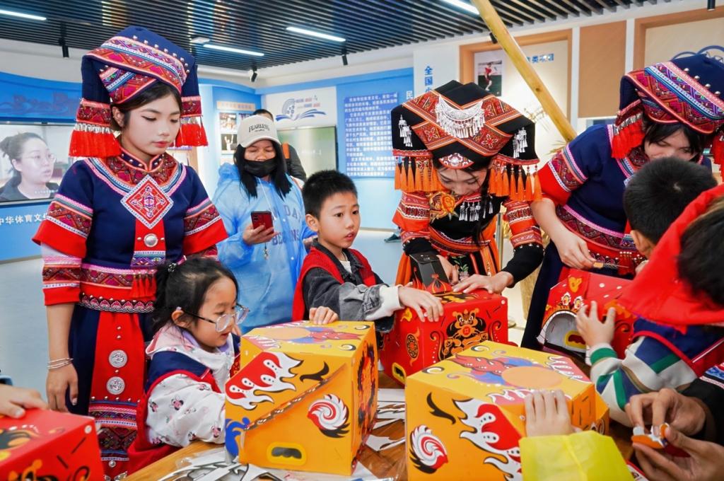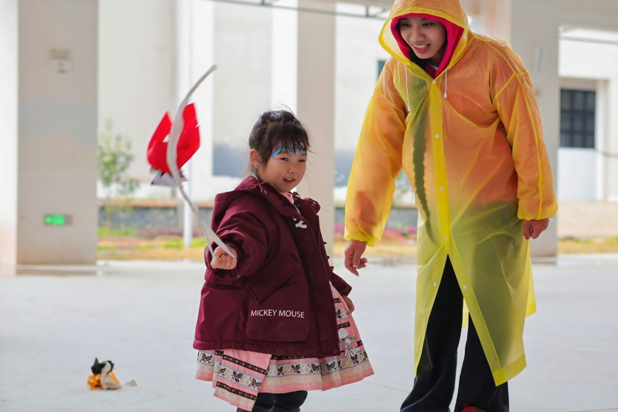 “嘿嘹嘹啰……”,活动在一阵悠扬的山歌声中拉开帷幕。在民族文化主题活动区,孩子们亲身参与民族特色手工diy、背篓绣球、竹竿舞三大项目,沉浸式感受壮文化。在民族特色手工制作中,通过学习绣球刺绣、制作醒狮狮头,深入了解壮族等少数民族文化符号背后的历史渊源与民俗内涵。在"竹竿舞大挑战"和“投掷背篓绣球”区域,孩子们在讲解员的带领下跳竹竿舞、抛绣球,掀起阵阵欢腾,在孩子们参与中体验到传统体育的独特魅力。当天,活动还开办了创意集市,学生们别出心裁地将传统美食与现代审美结合,精心布置各具特色的摊位,现场展示售卖各种图案的五色糯米拼盘、艾叶粑粑、壮元素手工艺品、潮玩公仔等,现场热闹非凡。