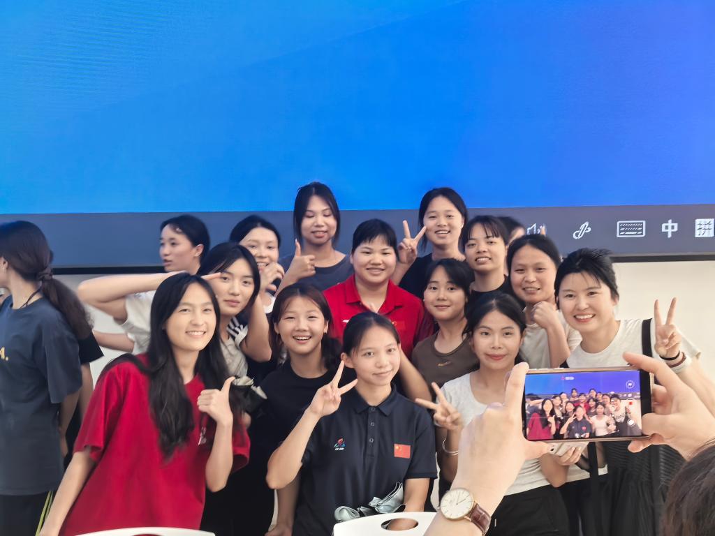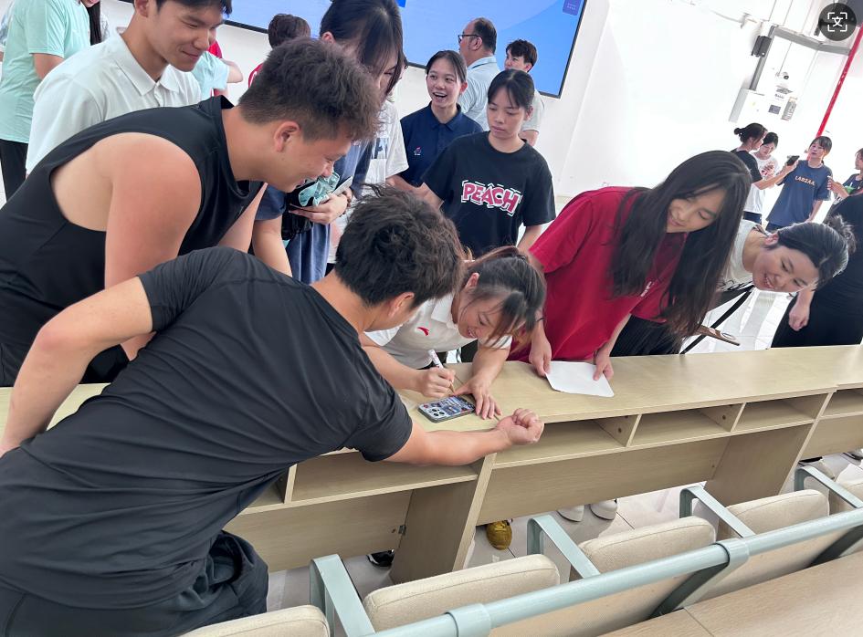活动结束后,学生们热情不减,纷纷簇拥着两位冠军争相合影、签名。手机壳、训练服、笔记本、运动护腕等物品被高高举起,成为承载冠军寄语的特殊载体。梁小梅与蒋惠花耐心地俯身接过每件物品,一笔一划认真写下“坚持就是胜利”“拼搏成就梦想” 等暖心祝福,微笑着与同学们定格合影瞬间。现场气氛热烈而温馨,学子们眼中闪烁着崇拜与憧憬的光芒,手中的签名物品不仅是一次近距离接触偶像的纪念,更像是一把点燃奋斗热情的火种,让体育精神在互动中悄然传递、生根发芽。