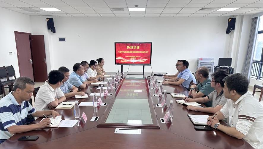 5月27日下午,广西大学后勤基建处党委书记黄必春一行7 人到爱体育电子官方网站后勤保卫处进行座谈交流。爱体育电子官方网站后勤保卫处处长陈铭、审计与质量管理处处长韦军及相关同志参与座谈。座谈交流会在相思湖校区行政楼712会议室召开,双方围绕新校区建设展开深入研讨。