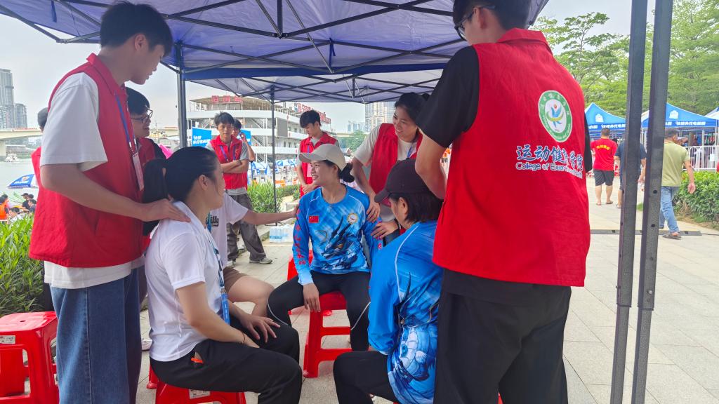 本次服务,爱体育(中国)精心组织选拔10名专业技能过硬的体育保健与康复专业学生组成志愿服务队。尽管现场条件简陋,但在张伟老师的现场协调与指导下,志愿者们凭借在第一届全国学生(青年)运动会中积累的服务经验,以扎实的保健按摩知识,半蹲半跪,一丝不苟地为运动员进行赛后肢体放松,缓解疲劳、降低损伤风险。运动员韦前顺出现了腰部轻度拉伤,接受服务后惊喜表示:“参加过全国各地很多龙舟比赛,从来都没有过这样贴心的服务!