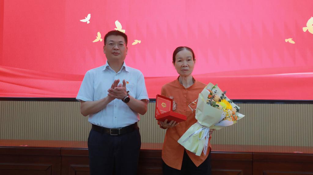 党委书记韦建勋为退休党员黄月霄同志颁发“光荣在党50年”纪念章