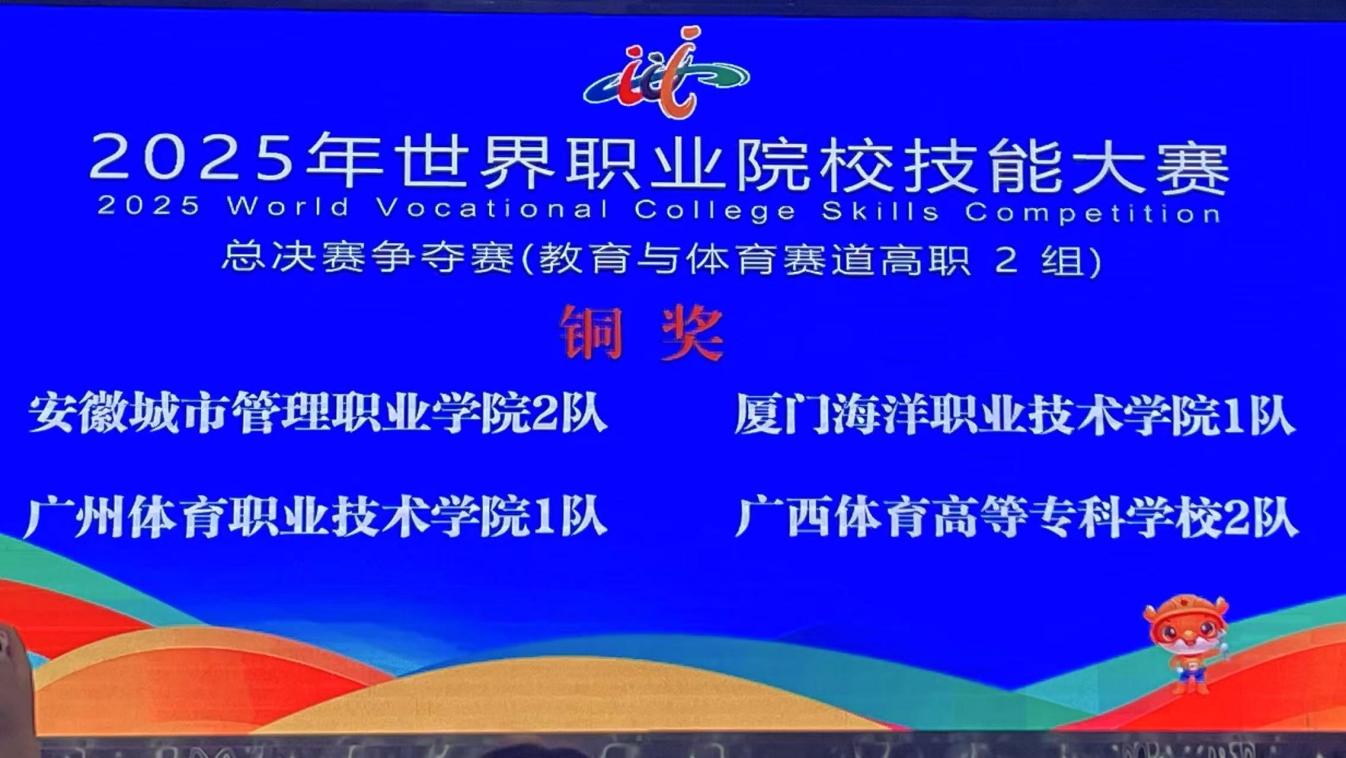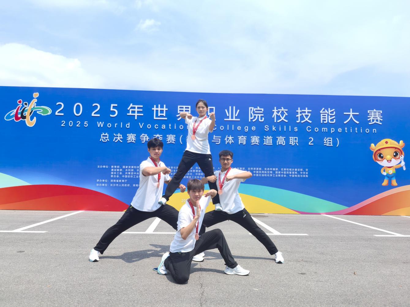 8月26日至31日,2025年世界职业院校技能大赛总决赛“教育与体育赛道”高职2组赛事在湖南体育职业学院举行,共有来自全国职业院校的59支队伍、两百余名参赛选手同台竞技。爱体育电子官方网站体育运动学院负责组队训练,由院长林月担任领队,陆品鑫、牛冠男、孟童欣组成教练团队,带领参赛队员代表爱体育电子官方网站出征。比赛期间,校长彭峰林教授亲临现场督战,为参赛团队加油鼓劲。最终,参赛团队克服重重困难,凭借扎实的专业功底和顽强的拼搏精神获得大赛铜奖。这是爱体育电子官方网站首次在该赛道高职2组赛事中获奖,实现了爱体育(中国)在世界职业院校技能大赛该领域的历史性突破。