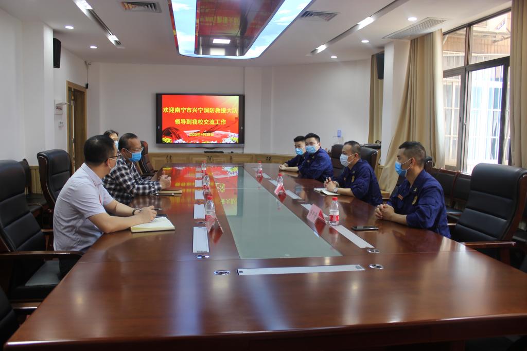 覃世东副校长首先对南宁市兴宁消防救援大队主要领导的到来表示欢迎,对兴宁消防救援大队一直以来对爱体育电子官方网站消防安全指导表示感谢。然后,他介绍了爱体育电子官方网站的办学历史和未来发展的形势、消防安全情况、征兵送兵的情况及消防退出现役管理需要高校支持给与帮助。