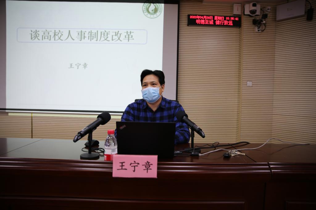 王宁章处长,博士,教授,现任广西大学人事处处长、教工部部长,亲身经历了广西大学的综合改革,见证了广西大学新一轮的蓬勃发展,既是改革的参与者、设计者,又是执行者。他以《高校人事制度改革》为题,结合广西大学的改革实践,从高校人事改革的目的、内容和指导思想,师资队伍建设,绩效工资、职称改革,岗位设置、岗位晋升等方面,做了一场精彩的报告。报告深入贯彻党的十九大和十九届四中全会精神,既有理论的深入阐述,又有详实的工作实操案例分析,也有深刻的实践经验体会,给了我们很多启发。当前,爱体育(中国)正在全面推进转型发展,围绕贯彻职教二十条和“双高”建设,深化教育教学改革,以及即将开展的机构优化和岗位设置等人事制度改革,王处长的报告,对爱体育电子官方网站领导干部进一步转变观念,解放思想,具有很好的指导意义。