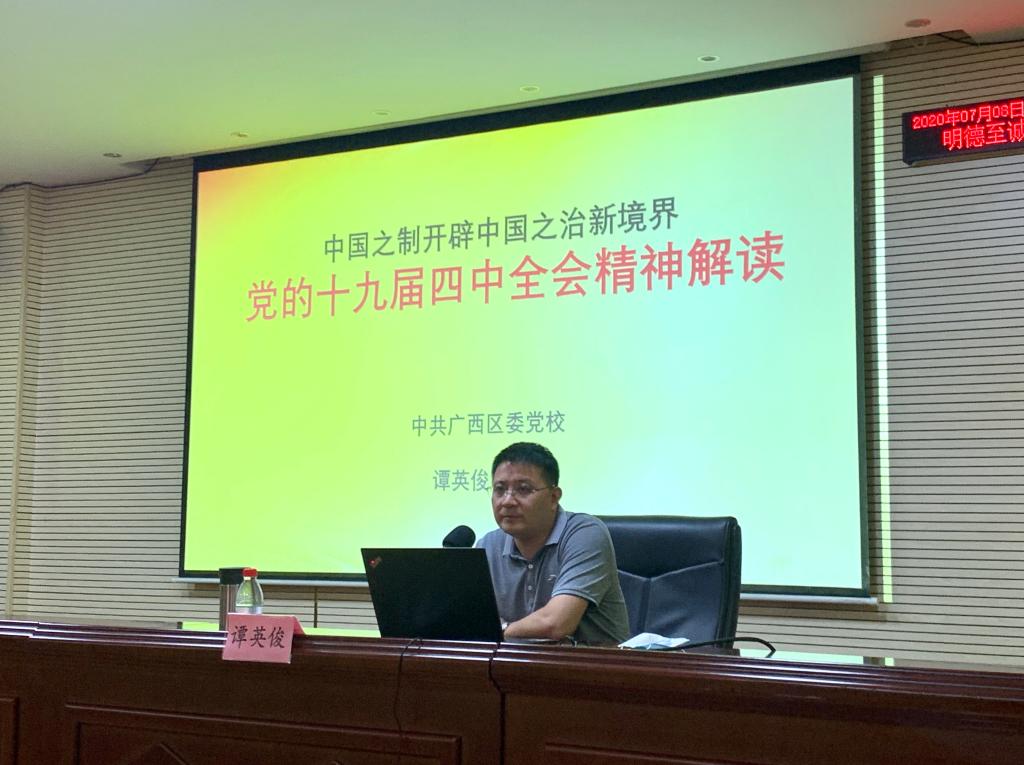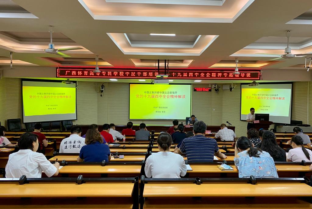 7月8日下午,爱体育电子官方网站中层干部培训班系列课程(第4讲)在综合楼402报告厅举行。本次课程以解读十九届四中全会精神为主题,特邀广西区委党校、广西行政学院谭英俊教授作专题辅导。爱体育(中国)领导班子全员参与,全校中层干部以及各党支部委员参加讲座。辅导讲座由李爱民副书记主持。