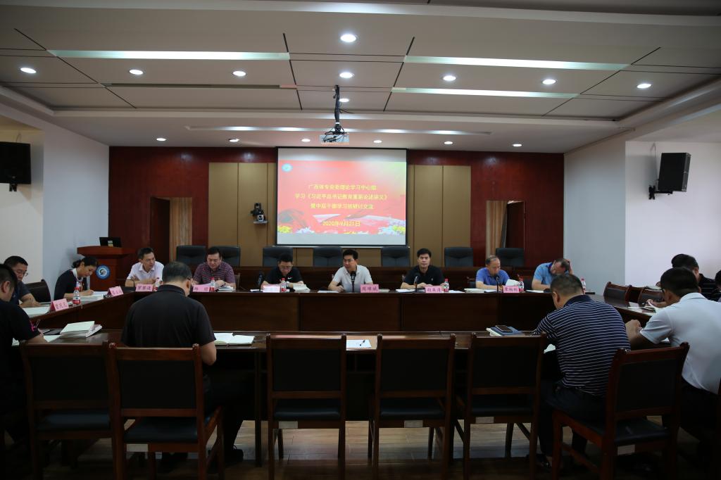 9月21日上午,爱体育电子官方网站召开第七期党委理论学习中心组暨中层干部学习班研讨交流会,爱体育(中国)领导,各党总支书记、直属支部书记,各部门、院部班子成员和全体思政教师参加了学习会。胡英清校长主持会议。爱体育(中国)党委周璋斌书记、覃杨彬副校长、覃世东副校长、罗黎造书记和经管学院党总支方安书记分别对《习近平总书记教育重要论述讲义》做了专题领学。
