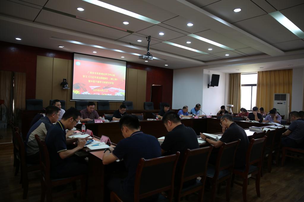 会中,胡英清校长、李爱民副书记、邱团副校长、岑益梅主任和曾庆光处长分别对《习近平谈治国理政》第三卷进行了专题领学。
