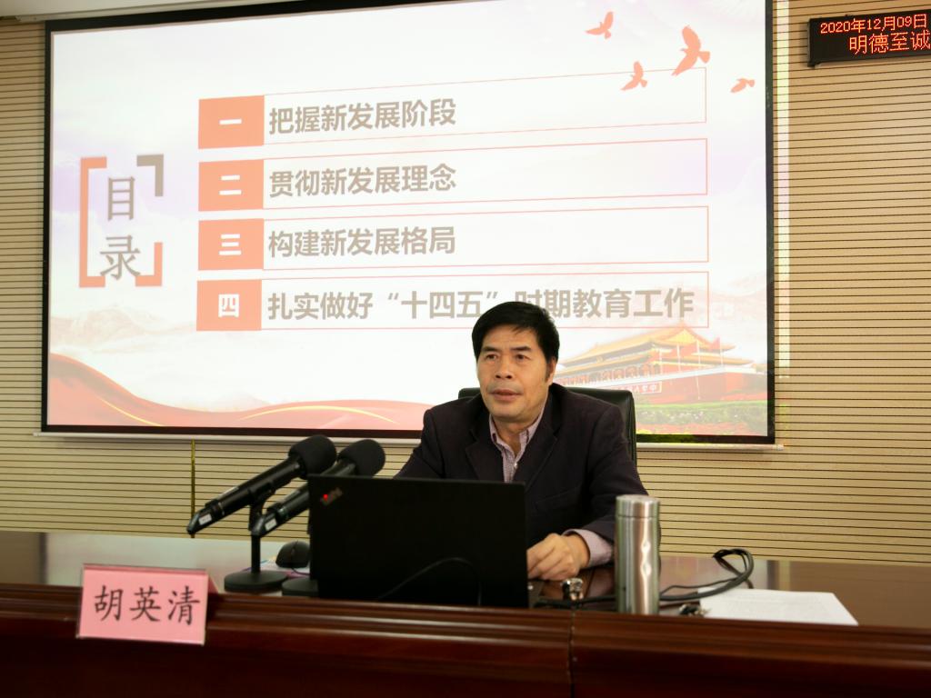 12月9日,爱体育电子官方网站第二期党的十九届五中全会精神宣讲报告会在本部校区综合楼402报告厅举行。胡英清校长作宣讲报告,李爱民副书记主持报告会。