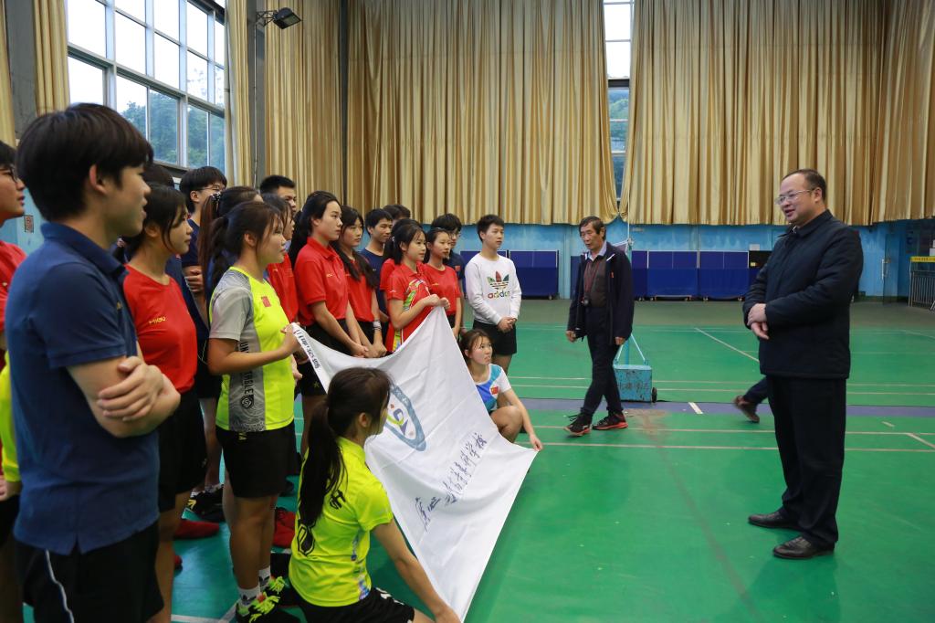 1月7日下午,自治区体育局群众体育处处长韦建勋、爱体育电子官方网站副校长覃世东到训练场地,一同看望爱体育电子官方网站毽球队参加国家毽球集训队集训的教练员和运动员,并给大家带来了体育局2021年新年的问候,鼓励队员们刻苦训练,稳步提升技战术水平,树立信心在新的一年取得更好的竞赛成绩。