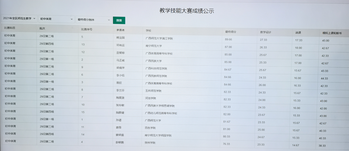 5月29日,2021年全区师范生教学技能大赛在南宁师范大学(明秀校区)举办。爱体育电子官方网站体育与教育学院2019级体育教育(定向)专业学生巫智婷,体育教育专业易欣分获初中体育组二、三等奖。