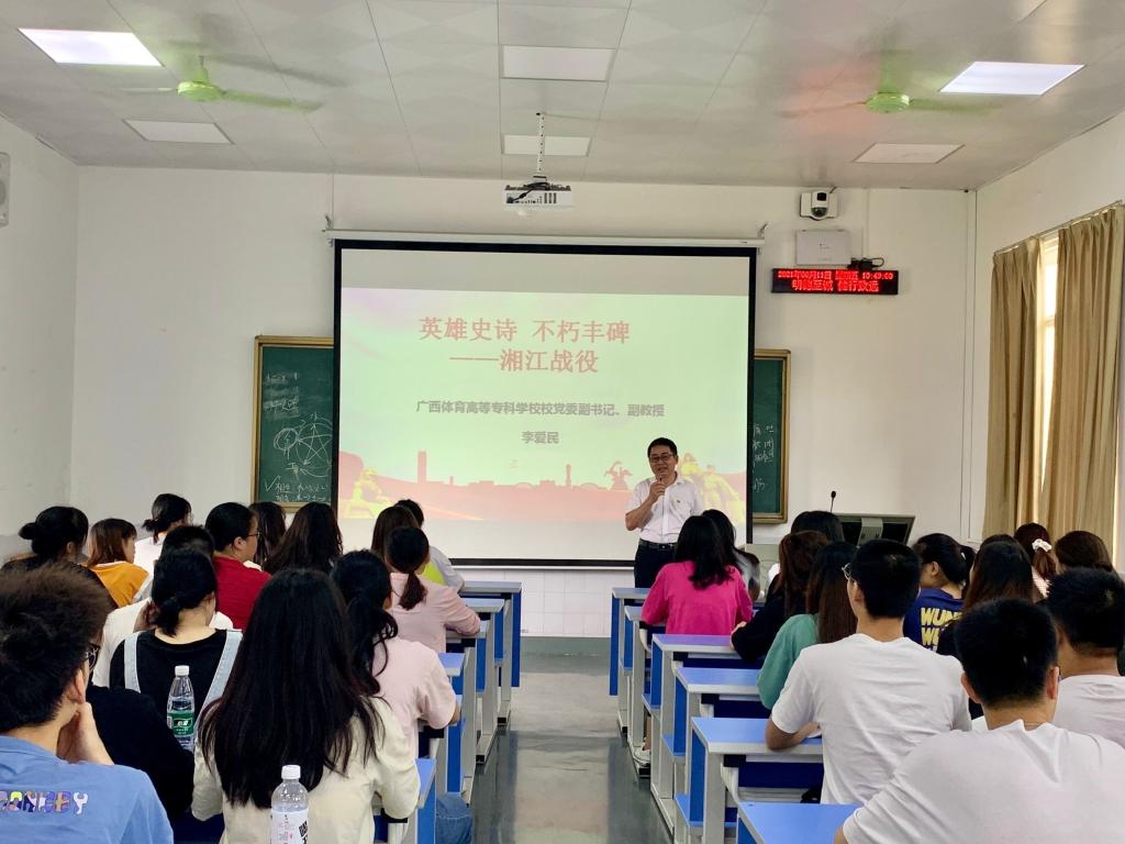 李爱民副书记结合党史学习教育,以《英雄史诗 不朽丰碑——湘江战役》为题,从湘江战役的背景、过程、历史意义及精神启迪四个方面,向同学们讲述了湘江战役历史。李爱民副书记按照时间顺序全面梳理了湘江战役从红军长征开始到渡过湘江的全过程,用一幅幅图表和生动的语言,把同学们带回到湘江战场。