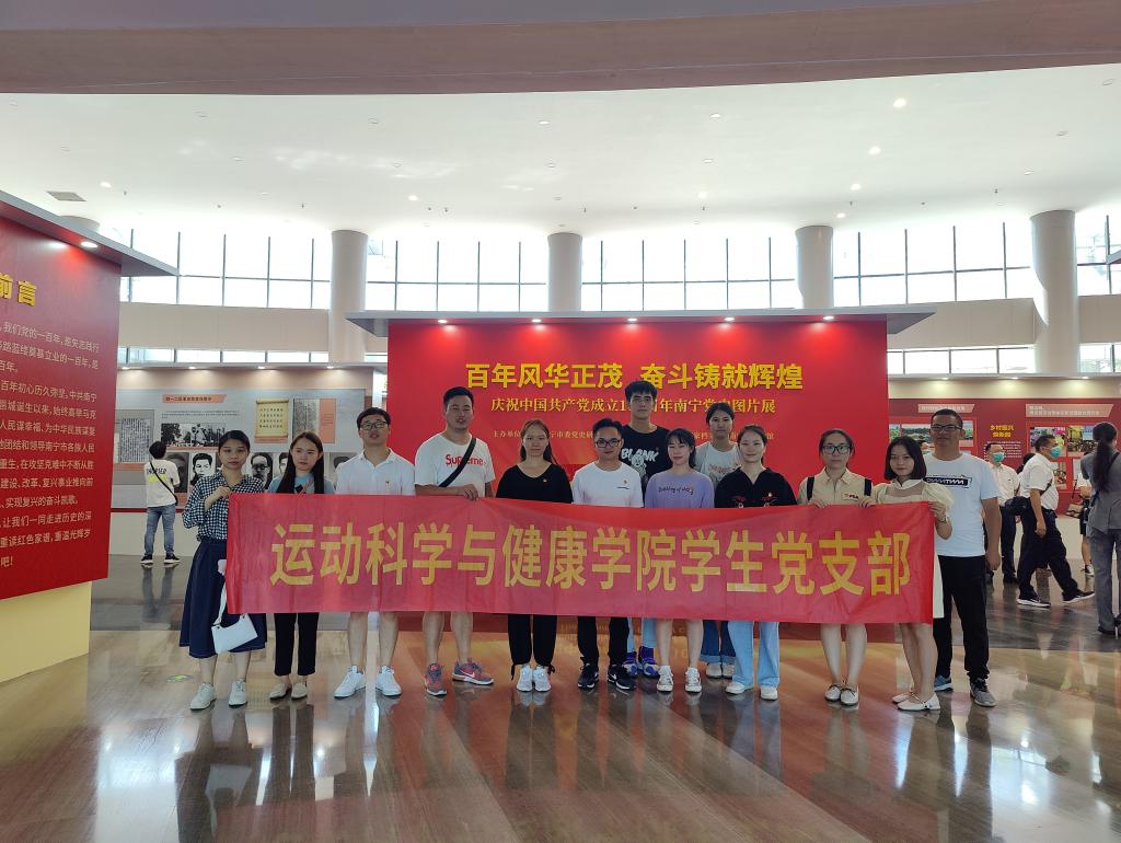为深入开展党史学习教育,重温红色历史记忆,进一步激发党员知史爱党、知史爱国的情怀,8月31日下午,运动科学与健康学院教师党支部和学生党支部全体党员集中在南宁博物馆开展主题党日活动,全体教师党员和学生党员参加活动,覃杨彬副校长以普通党员身份参加本次活动。活动由教师党支部书记朱晓东主持。活动的主题为:观百年党史图片展、重温红色历史记忆。