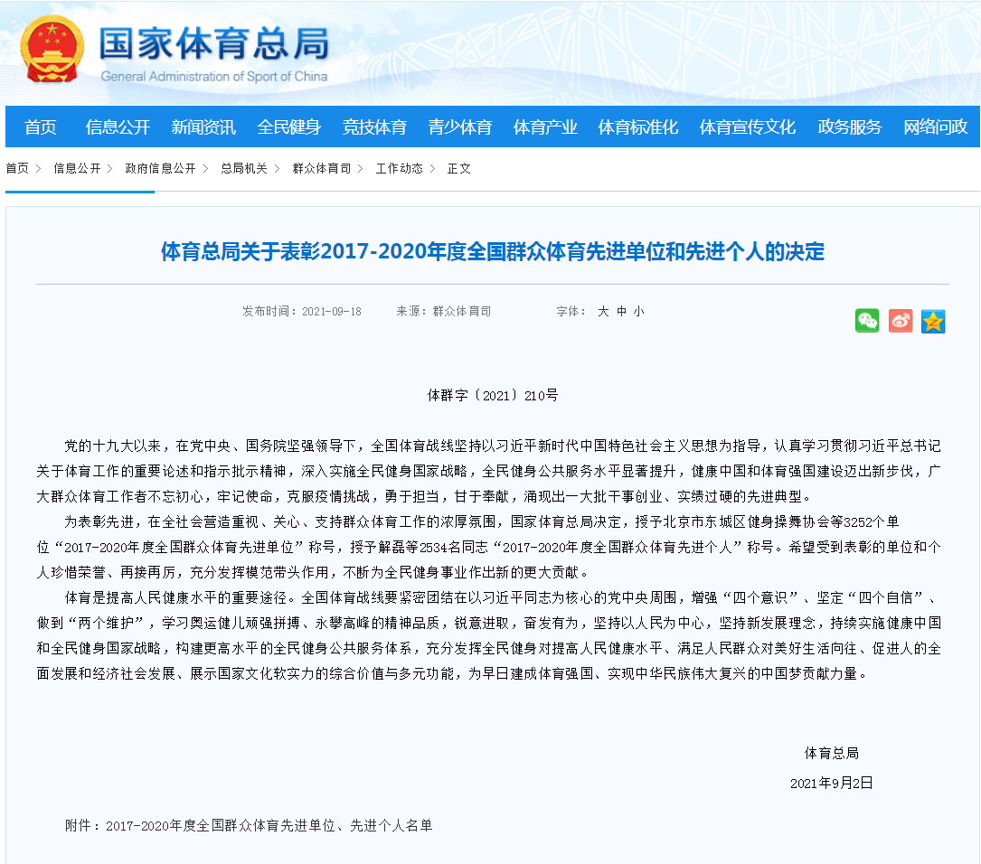 日前,爱体育电子官方网站喜获国家体育总局颁发的“2017-2020年全国群众体育先进单位”荣誉称号,宁小春、张忠、朱晓东、窦正毅四名教师荣获“全国群众体育先进个人”称号。这是爱体育电子官方网站连续第三次获此殊荣。据了解,“全国群众体育先进单位和先进个人”表彰是群众体育领域内唯一经中央批准开展的评比达标表彰类活动,是群众体育工作的国家最高荣誉,每四年评选一次,表彰对象主要是为我国群众体育事业作出重要贡献的集体和个人。