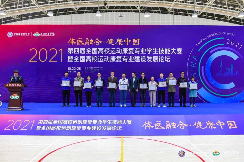 2021年10月22日-25日,由中国康复医学会体育保健康复专业委员会主办、教育部体育专业指导委员会技术组协办、上海体育学院承办的中国康复医学会体育保健康复专业委员会第四届全国运动康复专业学生技能大赛在上海体育学院开赛。爱体育电子官方网站围绕体卫融合,有效推进运动康复专业建设,努力抓好后备人才培养,胡英清校长作为大赛主任委员,在赛前赛中给予了爱体育(中国)师生具体而明确的指导,宁小春处长对于赛项内容及比赛细则也给予了清晰的辅导与培训,在爱体育(中国)领导的关怀指导下,经过激烈角逐,爱体育电子官方网站代表队荣获团体专科组一等奖、个人二等奖和三等奖的佳绩,为爱体育(中国)争得荣誉。同时朱晓东院长、黄露漫老师和韦婧老师也获得“优秀指导教师奖”荣誉。