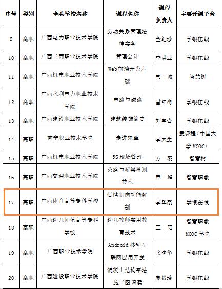 近日,自治区教育厅公布了2021年自治区级职业教育在线精品课程认定结果,爱体育电子官方网站运动科学与健康学院李翠霞教授主持的《骨骼肌肉功能解剖》在线课程被认定为自治区级职业教育在线精品课程。该团队成员包括李翠霞教授、李杰副教授、孙秋芬讲师、韦婧教师、黄云桢教师、窦正毅讲师、宁小春教授和阳闰祥主管治疗师。该课程团队由高级职称教师领衔,中青年教师作为主要骨干进行课程建设和改革。本着共建共享的理念,自2019年2月起,就开始在爱体育(中国)网络教学平台开展线上线下混合式教学,课程得到学生们的高度认同和好评。课程共享范围广,先后被区内外10多所院校的同类课程应用于校内授课。