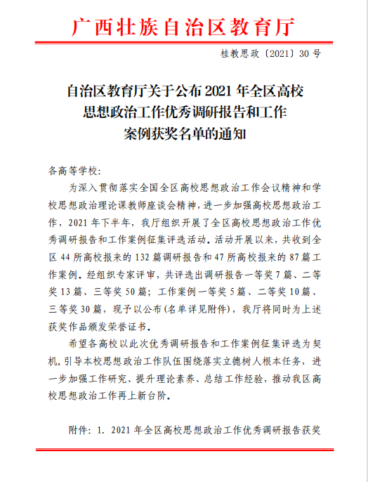 近日,2021年全区高校思想政治工作优秀调研报告和工作案例获奖名单揭晓。